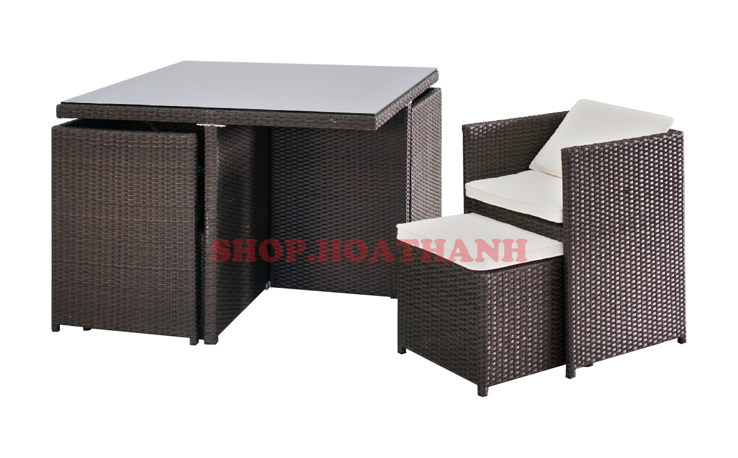 - Single chair : 53 x 53 x 68 cm- Stool : 43.5 x 43.5 x 36 cm- Table : 109.5 x 109.5 x 103.5 cm