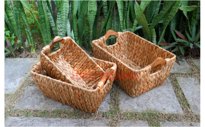 Set of 3 Water hyacinth baskets with wooden handles